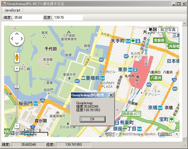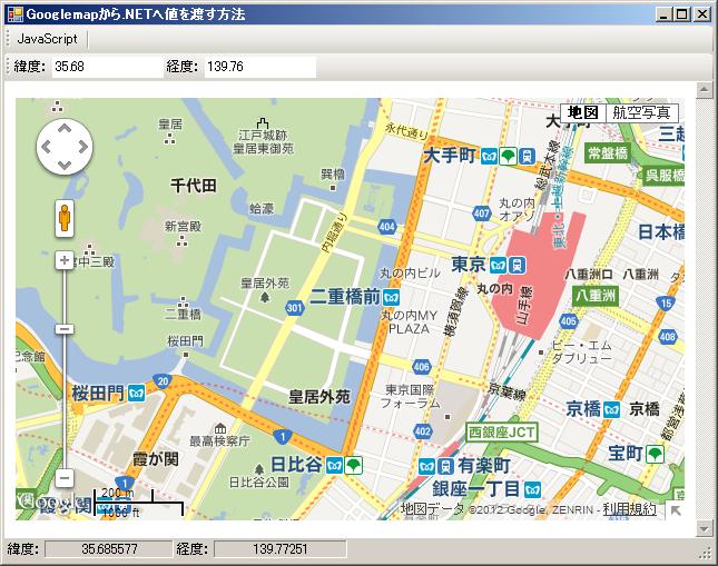 Imports System Imports System.Web Imports System.Xml Imports System.Security.Permissions Public Class Form1 Private Sub ToolStripButton1_Click(sender As System.Object, e As System.EventArgs) Handles ToolStripButton1.Click 'ObjectForScripting WebBrowserコントロールに表示される ' Webページ内のスクリプトコードからアクセスできるオブジェクトを ' 取得または設定します。 WebBrowser1.ObjectForScripting = New ExternalGMapObj 'クラスのインスタンスを渡す Dim lat As String = ToolStripTextBox1.Text Dim lng As String = ToolStripTextBox2.Text WebBrowser1.DocumentText = htmlDoc(lat, lng) End Sub Private Function htmlDoc(ByVal Lat As Double, ByVal Lng As Double) As String 'HTMLドキュメント GoogleMapなどjavascriptを読み込んだものでもよい。 '当然、PG外部の任意のURLをWebBrowserに表示させてもよい。 'ポイントは '「window.external.[VBのパブリックルーチン]」 'という形で、javascritから.NETアプリケーションにパラメータ・値を投げられることだと思う。 '.NETからDOMの操作はできると想像がつくが、これでその逆もできることになる。 Dim txtHtml As String = "" txtHtml = txtHtml & "<html>" & vbCrLf txtHtml = txtHtml & "<head>" & vbCrLf txtHtml = txtHtml & "<script type=""text/javascript"" src=""http://maps.google.com/maps/api/js?v=3.9&sensor=false""></script>" & vbCrLf txtHtml = txtHtml & "<script type=""text/javascript"">" & vbCrLf txtHtml = txtHtml & " var map;" & vbCrLf txtHtml = txtHtml & " function init() {" & vbCrLf txtHtml = txtHtml & " var latlng = new google.maps.LatLng(" & Lat.ToString & "," & Lng.ToString & ");" & vbCrLf txtHtml = txtHtml & " var myOptions = {" & vbCrLf txtHtml = txtHtml & " zoom: 15," & vbCrLf txtHtml = txtHtml & " center: latlng," & vbCrLf txtHtml = txtHtml & " mapTypeId: google.maps.MapTypeId.ROADMAP," & vbCrLf txtHtml = txtHtml & " overviewMapControl:true," & vbCrLf txtHtml = txtHtml & " scaleControl: true" & vbCrLf txtHtml = txtHtml & " };" & vbCrLf txtHtml = txtHtml & " map = new google.maps.Map(document.getElementById(""map_canvas""), myOptions);" & vbCrLf txtHtml = txtHtml & " google.maps.event.addListener(map, 'click', function(event) {" & vbCrLf txtHtml = txtHtml & " mouseClick(event.latLng);" & vbCrLf txtHtml = txtHtml & " });" & vbCrLf txtHtml = txtHtml & " google.maps.event.addListener(map, 'mousemove', function (event) {" txtHtml = txtHtml & " mousemove(event.latLng);" & vbCrLf txtHtml = txtHtml & " });" & vbCrLf txtHtml = txtHtml & " }" & vbCrLf 'mouse clieck event実装 txtHtml = txtHtml & " function mouseClick(location) {" & vbCrLf txtHtml = txtHtml & " window.external.MouseClick(location.lat(), location.lng());" txtHtml = txtHtml & " }" & vbCrLf 'mouse move evet実装 txtHtml = txtHtml & " function mousemove(location) {" & vbCrLf txtHtml = txtHtml & " window.external.MouseMove(location.lat(), location.lng());" txtHtml = txtHtml & " }" & vbCrLf txtHtml = txtHtml & "</script>" & vbCrLf txtHtml = txtHtml & "</head>" & vbCrLf txtHtml = txtHtml & "<body onload=""init();"">" & vbCrLf txtHtml = txtHtml & " <div id=""map_canvas"" style=""width:100%; height:100%""></div>" & vbCrLf txtHtml = txtHtml & "</body>" & vbCrLf txtHtml = txtHtml & "</html>" & vbCrLf htmlDoc = txtHtml End Function End Class 'PermissionSet 複数の異なる種類のアクセス許可を格納できるコレクションを表します。by MSDN 'SecurityAction.Demand コールスタック内の上位にあるすべての呼び出し元に、 ' 現在のインスタンスによって指定されているアクセス許可が与えられていない場合は、 ' 実行時に強制的にSecurityExceptionを呼び出します。by MSDN 'Name:="FullTrust" システムへのフルアクセス ' 参考http://www.atmarkit.co.jp/fdotnet/technology/idnfw11_08/idnfw11_08_02.html ' ちなみにこれを書かなくても動く。MSのサンプルにはついている。 'ComVisibleAttribute 個々のマネージ型またはマネージメンバ、 ' またはアセンブリ内のすべての型のCOM参照可能範囲を制御します。by MSDN ' これは、マネージ型がCOMから参照できることを示します。 by MSDN <PermissionSet(SecurityAction.Demand, Name:="FullTrust")> _ <System.Runtime.InteropServices.ComVisibleAttribute(True)> _ Public Class ExternalGMapObj Public Sub MouseClick(ByVal lat As Double, ByVal lng As Double) MsgBox("Googlemap" & vbCrLf & _ "緯度:" & Format(lat, "###.######").ToString & vbCrLf & _ "経度:" & Format(lng, "###.######").ToString, MsgBoxStyle.OkOnly, _ "Googlemapから取得") 'Form1.ToolStripStatusLabel2.Text = Format(lat, "###.######").ToString 'Form1.ToolStripStatusLabel4.Text = Format(lng, "###.######").ToString End Sub Public Sub MouseMove(ByVal lat As Double, ByVal lng As Double) 'MsgBox("Googlemap" & vbCrLf & _ ' "緯度:" & lat.ToString & vbCrLf & _ ' "経度:" & lng.ToString, MsgBoxStyle.OkOnly, "Javascriptから取得") Form1.ToolStripStatusLabel2.Text = Format(lat, "###.######").ToString Form1.ToolStripStatusLabel4.Text = Format(lng, "###.######").ToString End Sub End Class