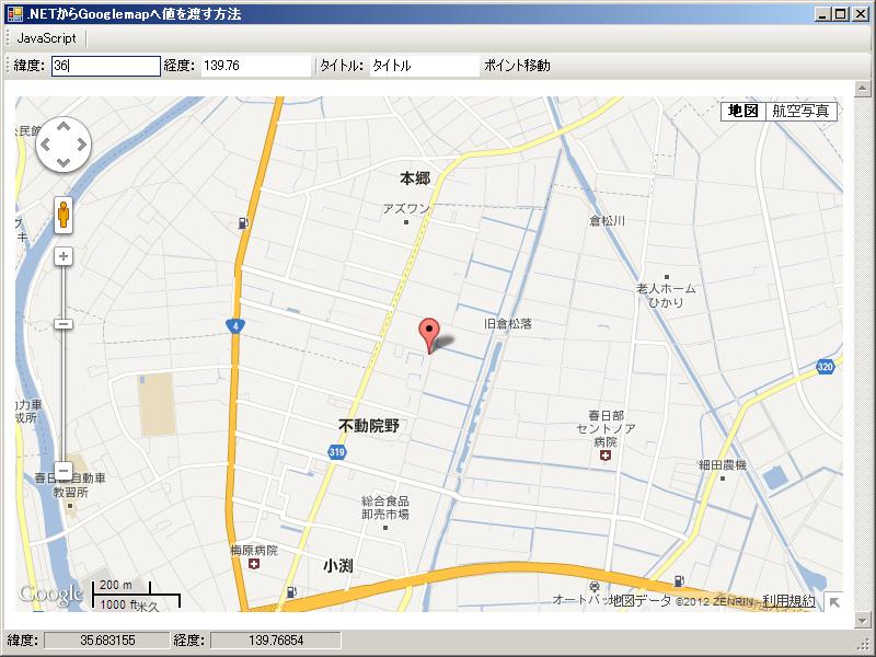 これができると、javascriptと.netとの値の受け渡しができるようになって、vb.net上でGooglemapを制御することができます。