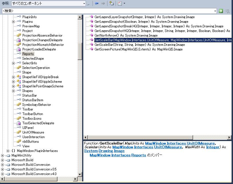 印刷機能をはじめから実装するのは、面倒なので、MapWindowのreports機能を使うのですが、まず、そのオブジェクト構成をオブジェクトブラウザでreportsの確認をしておきましょう。