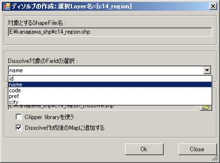 Dissolve作成formの表示して、Dissolve作成に使う属性値Fieldを選択します。