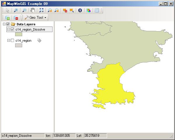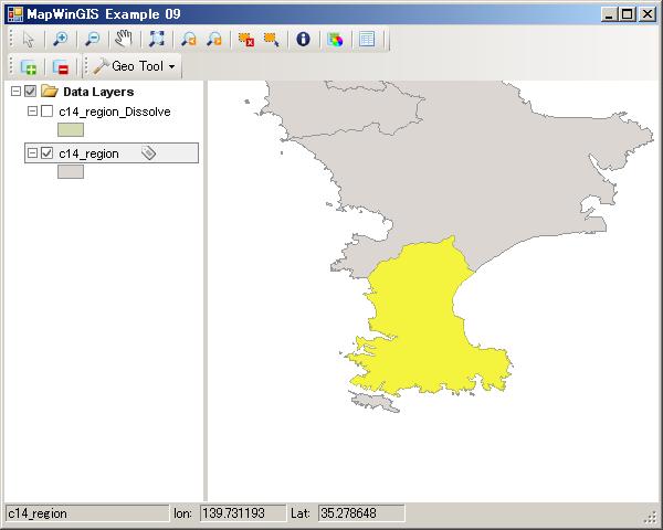 今回は、神奈川県のサンプルc14_region.shpを読み込んで表示させます。c14_region.shpは神奈川県市区町村データでPolygonデータです。