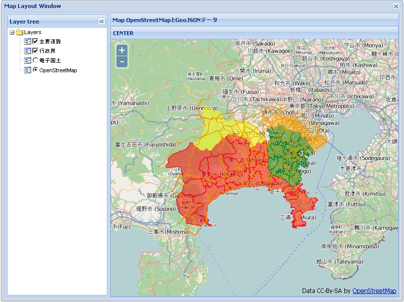 Ext.onReady(function() { var map = null; // 座標系の設定 var epsg4326 = new OpenLayers.Projection("EPSG:4326"); var epsg3857 = new OpenLayers.Projection("EPSG:3857"); var map = new OpenLayers.Map(); // openstreetmapの作成 var osmLayer = new OpenLayers.Layer.OSM("OpenStreetMap"); // 電子国土の作成 var webtisLayer = new webtis.Layer.BaseMap("電子国土"); map.displayProjection = epsg4326; // controlの設定 // map.addControl(new OpenLayers.Control.LayerSwitcher()); map.addControl(new OpenLayers.Control.MousePosition()); map.addControl(new OpenLayers.Control.(|>)); // create vector layer var context = { getColor : function(feature) { var index; if (feature.attributes.name.indexOf("横浜") > -1) { return 'green'; } else if (feature.attributes.name.indexOf("川崎") > -1) { return 'orange'; } else if (feature.attributes.name.indexOf("相模原") > -1) { return 'yellow'; } else { return 'red'; } } }; // polygon template var template = { fillOpacity : 0.5, fillColor : "${getColor}", strokeWidth : 1, strokeOpacity : 1, strokeColor : "${getColor}" }; var style = new OpenLayers.Style(template, { context : context }); // 神奈川県の市区町村行政界 var prefLayer = new OpenLayers.Layer.Vector("行政界", { strategies : [new OpenLayers.Strategy.Fixed()], styleMap : new OpenLayers.StyleMap({ 'default' : style }), protocol : new OpenLayers.Protocol.HTTP({ url : "../data/c14_region.json", format : new OpenLayers.Format.GeoJSON() }) }); // 神奈川県の主要道路 var roadLayer = new OpenLayers.Layer.Vector("主要道路", { strategies : [new OpenLayers.Strategy.Fixed()], protocol : new OpenLayers.Protocol.HTTP({ url : "../data/c14_road.json", format : new OpenLayers.Format.GeoJSON() }) }); // layerの追加 map.addLayers([osmLayer, webtisLayer, prefLayer, roadLayer]); map.setCenter(new OpenLayers.LonLat(139.4, 35.4).transform(epsg4326, epsg3857), 9); // create map panel var mapPanel = new GeoExt.MapPanel({ title : "CENTER", region : "center", height : 250, width : 600, map : map, zoom : 9 }); var treePanel = new Ext.tree.TreePanel({ title : 'Layer tree', region : 'west', split : true, width : 200, collapsible : true, margins : '3 0 3 3', cmargins : '3 3 3 3', // width: 145, // height: 300, // renderTo: "tree", root : new GeoExt.tree.LayerContainer({ layerStore : mapPanel.layers, expanded : true }) }); var centerPanel = new Ext.Panel({ title : 'Map OpenStreetMapとGeoJSONデータ', region : 'center', layout : 'border', //items : [mapPanel, gridPanel] items : [mapPanel] }); var win = new Ext.Window({ title : 'Map Layout Window', closable : true, width : 800, height : 600, // border:false, plain : true, layout : 'border', items : [treePanel, centerPanel] }); win.show(); });