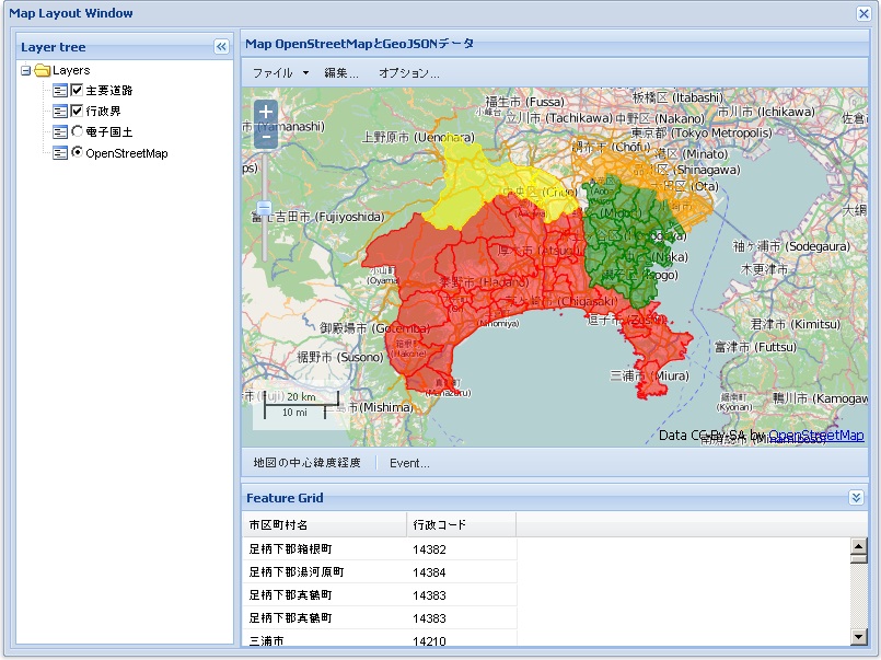 神奈川県の行政界と主要道路GeoJSONデータ読み込み