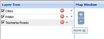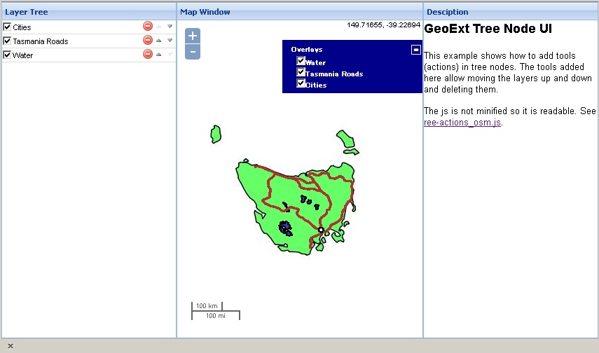Ext.onReady(function() { Ext.QuickTips.init(); // mapの作成 var map = new OpenLayers.Map(); // Tasmania State Boundaries Layerの作成 // Base Layer var TasmaniaLayer = new OpenLayers.Layer.WMS("Tasmania State Boundaries", "http://demo.opengeo.org/geoserver/wms", { layers : "topp:tasmania_state_boundaries" }, { buffer : 0, // exclude this layer from layer container nodes displayInLayerSwitcher : false }); // Water Layerの作成 var WaterLayer = new OpenLayers.Layer.WMS("Water", "http://demo.opengeo.org/geoserver/wms", { layers : "topp:tasmania_water_bodies", transparent : true, format : "image/gif" }, { buffer : 0 }); // Cities Layerの作成 var CitiesLayer = new OpenLayers.Layer.WMS("Cities", "http://demo.opengeo.org/geoserver/wms", { layers : "topp:tasmania_cities", transparent : true, format : "image/gif" }, { buffer : 0 }); // Tasmania Roads Layerの作成 var RoadsLayer = new OpenLayers.Layer.WMS("Tasmania Roads", "http://demo.opengeo.org/geoserver/wms", { layers : "topp:tasmania_roads", transparent : true, format : "image/gif" }, { buffer : 0 }); // layerの追加 map.addLayers([TasmaniaLayer, WaterLayer, RoadsLayer, CitiesLayer]); // map center map.setCenter(new OpenLayers.LonLat(146.1569825, -41.6109735)); // controlの追加 map.addControl(new OpenLayers.Control.ScaleLine()); map.addControl(new OpenLayers.Control.LayerSwitcher()); map.addControl(new OpenLayers.Control.MousePosition()); // the map panel // centerPanel var mapPanel = new GeoExt.MapPanel({ title : 'Map Window', border : true, region : "center", zoom : 7, map : map }); // the layer tree panel. In this tree the node actions are set using // the loader's "baseAttrs" property. // westPanel var tree = new Ext.tree.TreePanel({ region : "west", width : 250, title : "Layer Tree", loader : { applyLoader : false, uiProviders : { "ui" : GeoExt.examples.LayerNodeUI } }, // apply the tree node actions plugin to layer nodes plugins : [{ ptype : "gx_treenodeactions", listeners : { action : GeoExt.examples.onAction } }], root : { nodeType : "gx_layercontainer", loader : { baseAttrs : { radioGroup : "radiogroup", uiProvider : "ui", actions : [{ action : "delete", qtip : "delete" }, { action : "up", qtip : "move up", update : function(el) { // "this" references the tree node var layer = this.layer, map = layer.map; if (map.getLayerIndex(layer) == map.layers.length - 1) { el.addClass('disabled'); } else { el.removeClass('disabled'); } } }, { action : "down", qtip : "move down", update : function(el) { // "this" references the tree node var layer = this.layer, map = layer.map; if (map.getLayerIndex(layer) == 1) { el.addClass('disabled'); } else { el.removeClass('disabled'); } } }] } } }, rootVisible : false, lines : false }); // eastPanel var descPanel = { title : 'Desciption', region : "east", contentEl : "desc", width : 250 }; // the viewport new Ext.Viewport({ layout : "fit", hideBorders : true, items : { layout : "border", deferredRender : false, items : [mapPanel, tree, descPanel] } }); });