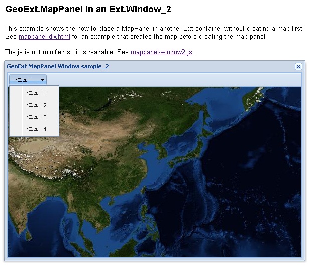 var mapPanel; Ext.onReady(function() { // Layerの作成 var wmslayer = new OpenLayers.Layer.WMS( "Global Imagery", "http://maps.opengeo.org/geowebcache/service/wms", {layers: "bluemarble"} ); // 表示するwindowの作成 var mapwin = new Ext.Window({ title: "GeoExt MapPanel Window sample_2", height: 400, width: 600, layout: "fit", items: [{ xtype: "gx_mappanel", id: "mappanel", layers: [wmslayer], extent: "100,10,150,50", tbar : [ { xtype : 'tbbutton', text : 'メニュー...', menu : [ { text : 'メニュー1', selectType: 1, handler : menuProc }, { text : 'メニュー2', selectType: 2, handler : menuProc }, { text : 'メニュー3', selectType: 3, handler : menuProc }, { text : 'メニュー4', selectType: 4, handler : menuProc } ] } ] }] }); // mapwinの表示 mapwin.show(); mapPanel = Ext.getCmp("mappanel"); }); function menuProc(obj){ Ext.Msg.alert('メニュー番号', '選択した' + obj.selectType +'番です。' ); //gmap.setMapTypeId(obj.mapType); }
