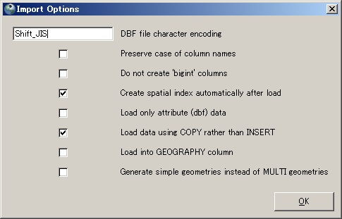 ここで、エラーが出た場合は、dbfのcharactor設定かShapefile自身のエラーですので、QGIS等を使ってShapefileをチェックして修正したください。