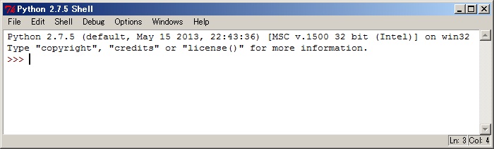 スタート → プログラム → Python 2.7 → IDLE(Python GUI)でShellを動かすと、