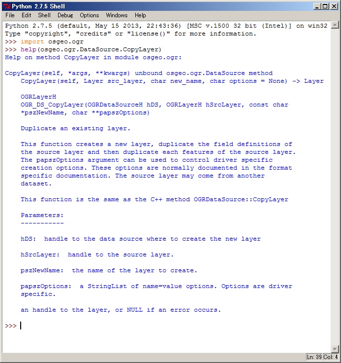 たとえば、osgeo.ogr.DataSource.CopyLayerをどのように呼び出すのか?