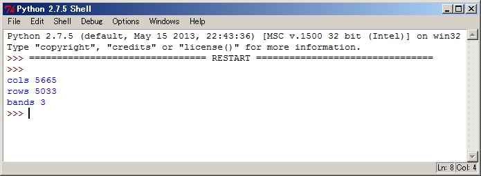 今回は、Python GUI Shellを使って、超~~簡単なGDALのexampleを作成しました。Numpyもinstallして作図も行いました。