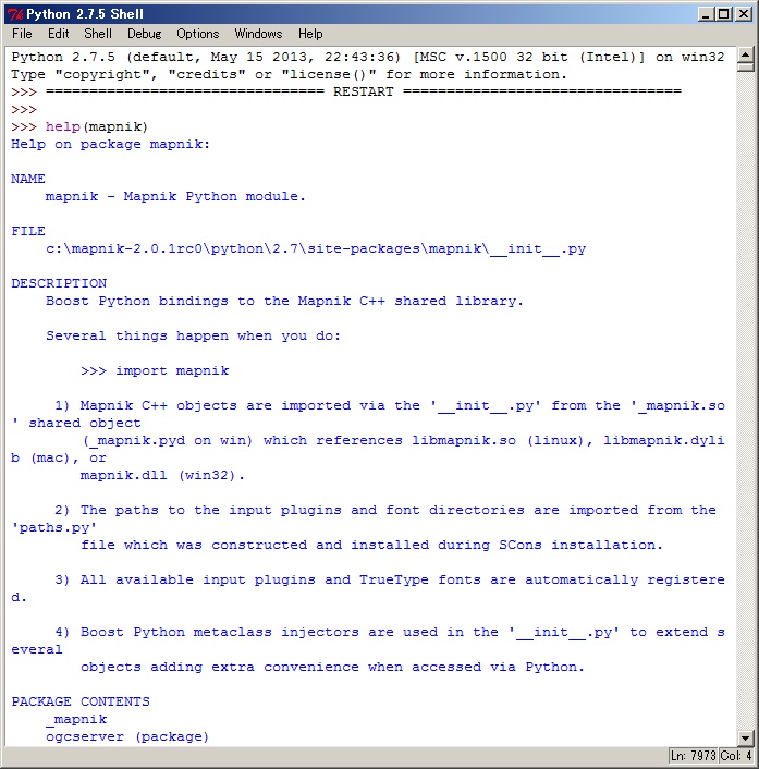 次に、スタート → プログラム → Python 2.7 → IDLE(Python GUI)でShellを動かて、メニューから File → Open で先ほどのmapnik-example.pyを読み込みこむと、