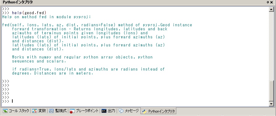 geod.fwd関数とは、PyScripterのインタプリタ上でhelp(geod.fwd)