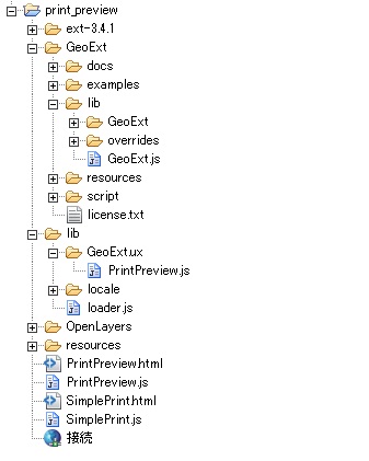 となり、Ext.namespace(“GeoExt.ux”);でGeoExt.uxとして定義し、Ext.reg(“gxux_printpreview”, GeoExt.ux.PrintPreview);で利用できるようになっています。