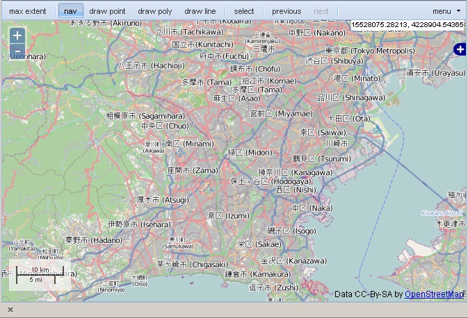Ext.onReady(function() { Ext.QuickTips.init(); // 座標系の設定 var epsg4326 = new OpenLayers.Projection("EPSG:4326"); var epsg3857 = new OpenLayers.Projection("EPSG:3857"); // mapの作成 var map = new OpenLayers.Map(); // openstreetmapの作成 var osmLayer = new OpenLayers.Layer.OSM("OpenStreetMap"); // 電子国土の作成 var webtisLayer = new webtis.Layer.BaseMap("電子国土"); var vectorLayer = new OpenLayers.Layer.Vector("作図Layer"); map.addLayers([osmLayer, webtisLayer, vectorLayer]); // controlの設定 map.addControl(new OpenLayers.Control.MousePosition()); map.addControl(new OpenLayers.Control.ScaleLine()); map.addControl(new OpenLayers.Control.LayerSwitcher()); map.addControl(new OpenLayers.Control.MousePosition()); // 初期表示の緯度経度 var zoomlevel = 10; var initLon = 139.5; var initLat = 35.5 map.setCenter(new OpenLayers.LonLat(initLon, initLat).transform(epsg4326, epsg3857), zoomlevel); // actionの設定 var ctrl, toolbarItems = [], action, actions = {}; // ZoomToMaxExtent control, a "button" control action = new GeoExt.Action({ text : "max extent", control : new OpenLayers.Control.ZoomToMaxExtent(), map : map, tooltip : "全体を表示する。" }); actions["max_extent"] = action; toolbarItems.push(action); toolbarItems.push("-"); // Navigation control and DrawFeature controls // in the same toggle group action = new GeoExt.Action({ text : "nav", control : new OpenLayers.Control.Navigation(), map : map, // button options toggleGroup : "draw", allowDepress : false, pressed : true, tooltip : "ナビゲーション", // check item options group : "draw", checked : true }); actions["nav"] = action; toolbarItems.push(action); action = new GeoExt.Action({ text : "draw point", control : new OpenLayers.Control.DrawFeature(vectorLayer, OpenLayers.Handler.Point), map : map, // button options toggleGroup : "draw", allowDepress : false, tooltip : "ポイントを描く。", // check item options group : "draw" }); actions["draw_point"] = action; toolbarItems.push(action); action = new GeoExt.Action({ text : "draw poly", control : new OpenLayers.Control.DrawFeature(vectorLayer, OpenLayers.Handler.Polygon), map : map, // button options toggleGroup : "draw", allowDepress : false, tooltip : "ポリゴンを描く。", // check item options group : "draw" }); actions["draw_poly"] = action; toolbarItems.push(action); action = new GeoExt.Action({ text : "draw line", control : new OpenLayers.Control.DrawFeature(vectorLayer, OpenLayers.Handler.Path), map : map, // button options toggleGroup : "draw", allowDepress : false, tooltip : "ラインを描く。", // check item options group : "draw" }); actions["draw_line"] = action; toolbarItems.push(action); toolbarItems.push("-"); // SelectFeature control, a "toggle" control action = new GeoExt.Action({ text : "select", control : new OpenLayers.Control.SelectFeature(vectorLayer, { type : OpenLayers.Control.TYPE_TOGGLE, hover : true }), map : map, // button options enableToggle : true, tooltip : "図形を選択する。" }); actions["select"] = action; toolbarItems.push(action); toolbarItems.push("-"); // Navigation history - two "button" controls ctrl = new OpenLayers.Control.NavigationHistory(); map.addControl(ctrl); action = new GeoExt.Action({ text : "previous", control : ctrl.previous, disabled : true, tooltip : "前の表示状態に戻る。" }); actions["previous"] = action; toolbarItems.push(action); action = new GeoExt.Action({ text : "next", control : ctrl.next, disabled : true, tooltip : "次の表示状態に進む。" }); actions["next"] = action; toolbarItems.push(action); toolbarItems.push("-"); toolbarItems.push("->"); // Reuse the GeoExt.Action objects created above // as menu items toolbarItems.push({ text : "menu", menu : new Ext.menu.Menu({ items : [ // ZoomToMaxExtent actions["max_extent"], // Nav new Ext.menu.CheckItem(actions["nav"]), // Draw point new Ext.menu.CheckItem(actions["draw_point"]), // Draw poly new Ext.menu.CheckItem(actions["draw_poly"]), // Draw line new Ext.menu.CheckItem(actions["draw_line"]), // Select control new Ext.menu.CheckItem(actions["select"]), // Navigation history control actions["previous"], actions["next"]] }) }); // mapPanelの作成 var mapPanel = new GeoExt.MapPanel({ region : "center", map : map, zoom : zoomlevel, layers : [osmLayer, webtisLayer, vectorLayer], tbar : toolbarItems }); // viewportのcenterに表示 var win = new Ext.Viewport({ regin : 'center', title : 'Map Window', closable : true, plain : true, layout : 'border', items : [mapPanel] }); });