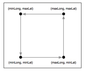 # Save the bounding box as a feature in the output # shapefile. linearRing = osgeo.ogr.Geometry(osgeo.ogr.wkbLinearRing) linearRing.AddPoint(minLong, minLat) linearRing.AddPoint(maxLong, minLat) linearRing.AddPoint(maxLong, maxLat) linearRing.AddPoint(minLong, maxLat) linearRing.AddPoint(minLong, minLat) polygon = osgeo.ogr.Geometry(osgeo.ogr.wkbPolygon) polygon.AddGeometry(linearRing)