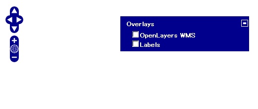 でMapが表示されます。LayerSwitcherをクリックすると2つのlayerがありますが、どちらもOverLayerとなっています。layerの表示をfalseにすると、