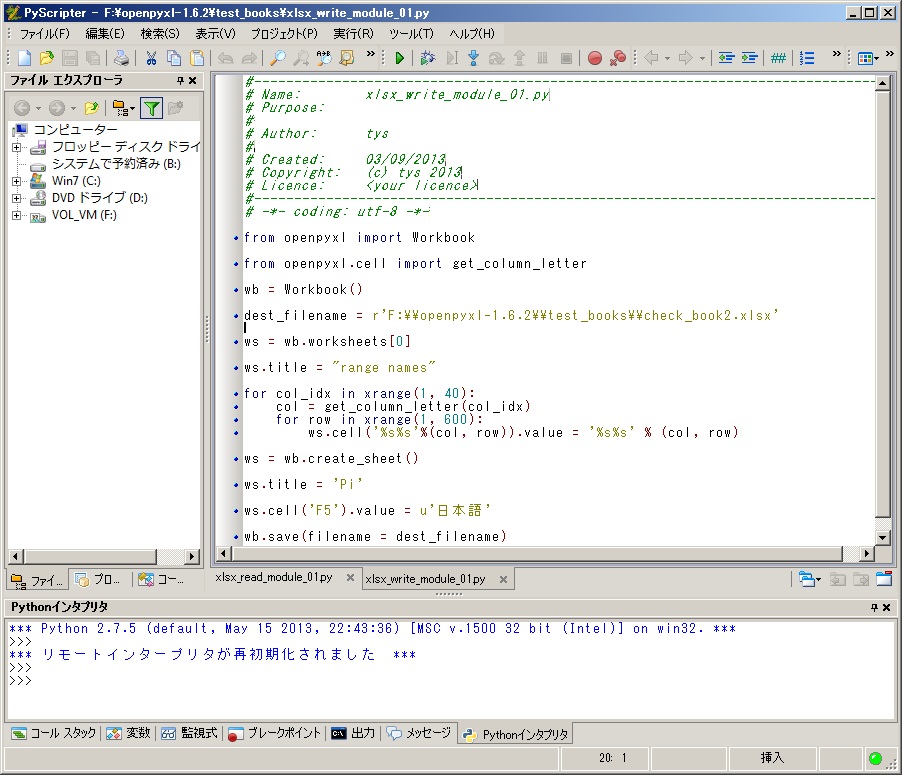 code入力後は、F:¥openpyxl-1.6.2¥test_books¥xlsx_write_module_01.pyに保存し、実行すると、