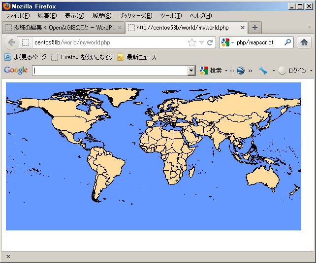 後は、ブラウザーでhttp://localhost/world/myworld.phpで世界地図が表示されます。
