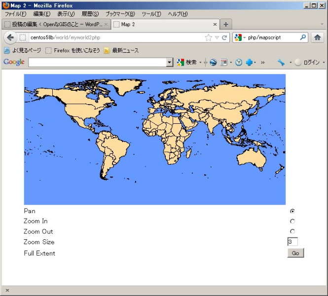 後は、ブラウザーでhttp://localhost/world/myworld2.phpで世界地図が表示されます。