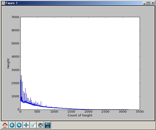 GLOBEデータセットからあるDEMデータをとり、そのデータを使用して、標高ヒストグラムを計算してみましょう。