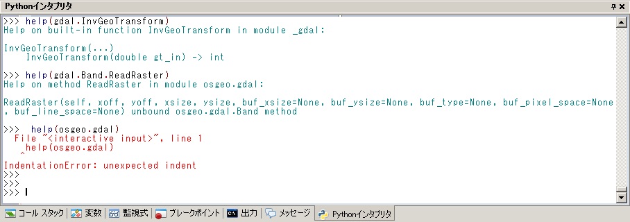 objectの引数が不明な場合は、PyScriptのインタプリタでhelp(gdal.Band.ReadRaster)などを入力すると、