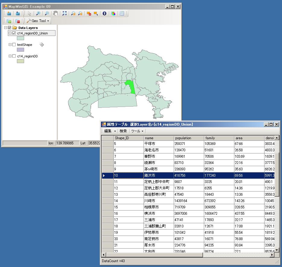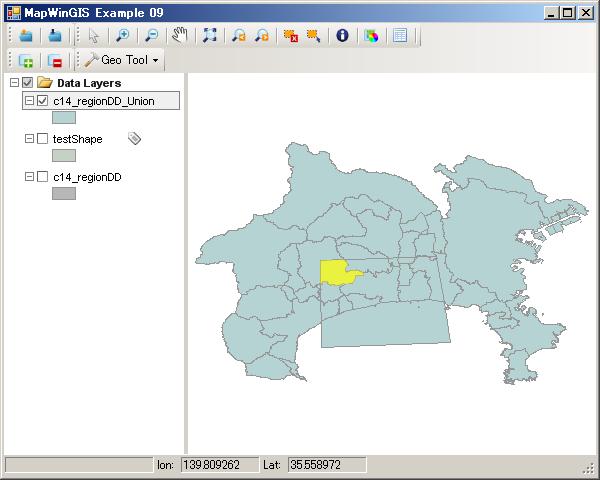 今回は、神奈川県のサンプルc14_regionDD.shpとtestShape.shpを読み込んで表示させます。