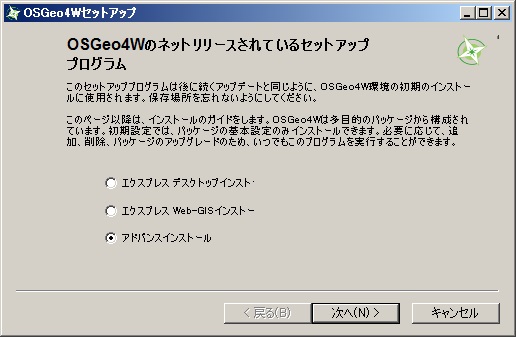 注意) osgeo4w-setup.exe実行は、管理者モードで行うこと。