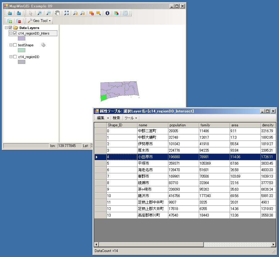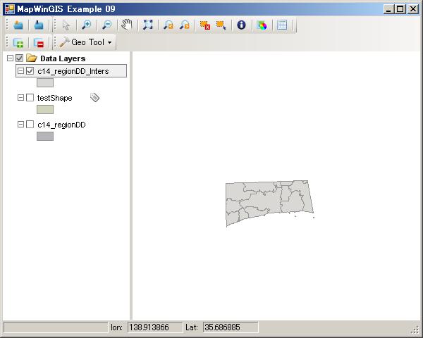 今回は、神奈川県のサンプルc14_regionDD.shpとtestShape.shpを読み込んで表示させます。