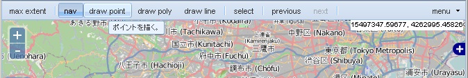 Ext.onReady(function() { Ext.QuickTips.init(); // 座標系の設定 var epsg4326 = new OpenLayers.Projection("EPSG:4326"); var epsg3857 = new OpenLayers.Projection("EPSG:3857"); // mapの作成 var map = new OpenLayers.Map(); // openstreetmapの作成 var osmLayer = new OpenLayers.Layer.OSM("OpenStreetMap"); // 電子国土の作成 var webtisLayer = new webtis.Layer.BaseMap("電子国土"); var vectorLayer = new OpenLayers.Layer.Vector("作図Layer"); map.addLayers([osmLayer, webtisLayer, vectorLayer]); // controlの設定 map.addControl(new OpenLayers.Control.MousePosition()); map.addControl(new OpenLayers.Control.ScaleLine()); map.addControl(new OpenLayers.Control.LayerSwitcher()); map.addControl(new OpenLayers.Control.MousePosition()); // 初期表示の緯度経度 var zoomlevel = 10; var initLon = 139.5; var initLat = 35.5 map.setCenter(new OpenLayers.LonLat(initLon, initLat).transform(epsg4326, epsg3857), zoomlevel); // actionの設定 var ctrl, toolbarItems = [], action, actions = {}; // ZoomToMaxExtent control, a "button" control action = new GeoExt.Action({ text : "max extent", control : new OpenLayers.Control.ZoomToMaxExtent(), map : map, tooltip : "全体を表示する。" }); actions["max_extent"] = action; toolbarItems.push(action); toolbarItems.push("-"); // Navigation control and DrawFeature controls // in the same toggle group action = new GeoExt.Action({ text : "nav", control : new OpenLayers.Control.Navigation(), map : map, // button options toggleGroup : "draw", allowDepress : false, pressed : true, tooltip : "ナビゲーション", // check item options group : "draw", checked : true }); actions["nav"] = action; toolbarItems.push(action); action = new GeoExt.Action({ text : "draw point", control : new OpenLayers.Control.DrawFeature(vectorLayer, OpenLayers.Handler.Point), map : map, // button options toggleGroup : "draw", allowDepress : false, tooltip : "ポイントを描く。", // check item options group : "draw" }); actions["draw_point"] = action; toolbarItems.push(action); action = new GeoExt.Action({ text : "draw poly", control : new OpenLayers.Control.DrawFeature(vectorLayer, OpenLayers.Handler.Polygon), map : map, // button options toggleGroup : "draw", allowDepress : false, tooltip : "ポリゴンを描く。", // check item options group : "draw" }); actions["draw_poly"] = action; toolbarItems.push(action); action = new GeoExt.Action({ text : "draw line", control : new OpenLayers.Control.DrawFeature(vectorLayer, OpenLayers.Handler.Path), map : map, // button options toggleGroup : "draw", allowDepress : false, tooltip : "ラインを描く。", // check item options group : "draw" }); actions["draw_line"] = action; toolbarItems.push(action); toolbarItems.push("-"); // SelectFeature control, a "toggle" control action = new GeoExt.Action({ text : "select", control : new OpenLayers.Control.SelectFeature(vectorLayer, { type : OpenLayers.Control.TYPE_TOGGLE, hover : true }), map : map, // button options enableToggle : true, tooltip : "図形を選択する。" }); actions["select"] = action; toolbarItems.push(action); toolbarItems.push("-"); // Navigation history - two "button" controls ctrl = new OpenLayers.Control.NavigationHistory(); map.addControl(ctrl); action = new GeoExt.Action({ text : "previous", control : ctrl.previous, disabled : true, tooltip : "前の表示状態に戻る。" }); actions["previous"] = action; toolbarItems.push(action); action = new GeoExt.Action({ text : "next", control : ctrl.next, disabled : true, tooltip : "次の表示状態に進む。" }); actions["next"] = action; toolbarItems.push(action); toolbarItems.push("-"); toolbarItems.push("->"); // Reuse the GeoExt.Action objects created above // as menu items toolbarItems.push({ text : "menu", menu : new Ext.menu.Menu({ items : [ // ZoomToMaxExtent actions["max_extent"], // Nav new Ext.menu.CheckItem(actions["nav"]), // Draw point new Ext.menu.CheckItem(actions["draw_point"]), // Draw poly new Ext.menu.CheckItem(actions["draw_poly"]), // Draw line new Ext.menu.CheckItem(actions["draw_line"]), // Select control new Ext.menu.CheckItem(actions["select"]), // Navigation history control actions["previous"], actions["next"]] }) }); // mapPanelの作成 var mapPanel = new GeoExt.MapPanel({ region : "center", map : map, zoom : zoomlevel, layers : [osmLayer, webtisLayer, vectorLayer], tbar : toolbarItems }); // viewportのcenterに表示 var win = new Ext.Viewport({ regin : 'center', title : 'Map Window', closable : true, plain : true, layout : 'border', items : [mapPanel] }); });