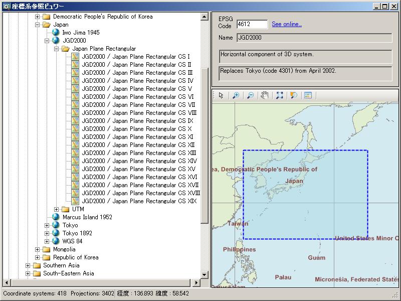 初期表示はJGD2000 EPSG 4612を表示しています。