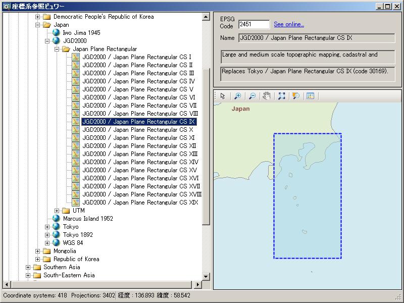 JapanのJDG2000平面直角座標IX系の詳細情報が表示されます。