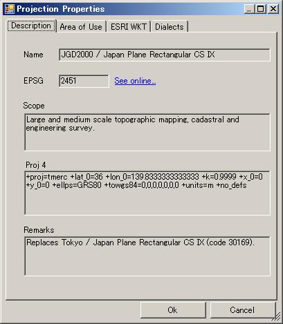 ProjectionMapのToolStripButtonのプロパティをクリックすると、Projection Properties DialognのDescription Tabが表示されます。