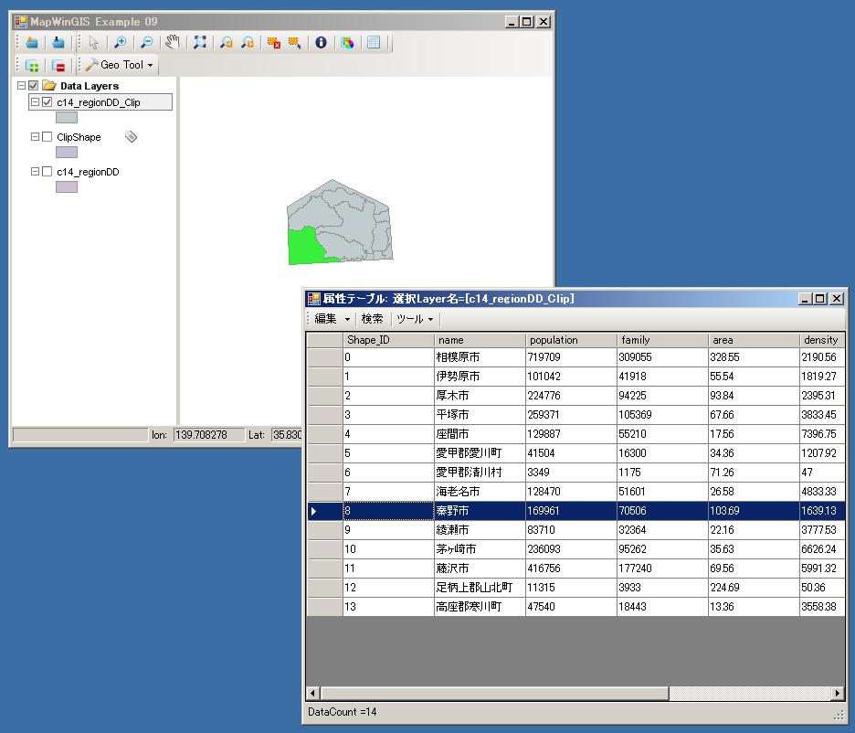 今回は、神奈川県のサンプルc14_regionDD.shpとtestShape.shpを読み込んで表示させます。