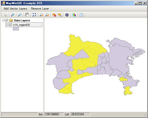 今回は、神奈川県のサンプルc14_regionDD.shpを読み込んだ後、属性値テーブル表示buttonをクリックして、属性値テーブル表示formを表示させて、属性検索ButtonをClickすると、属性検索Formが表示されます。