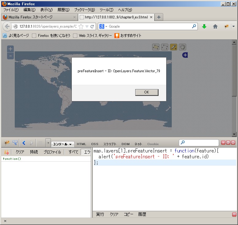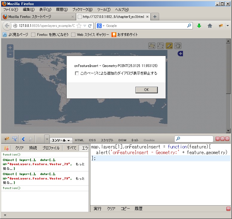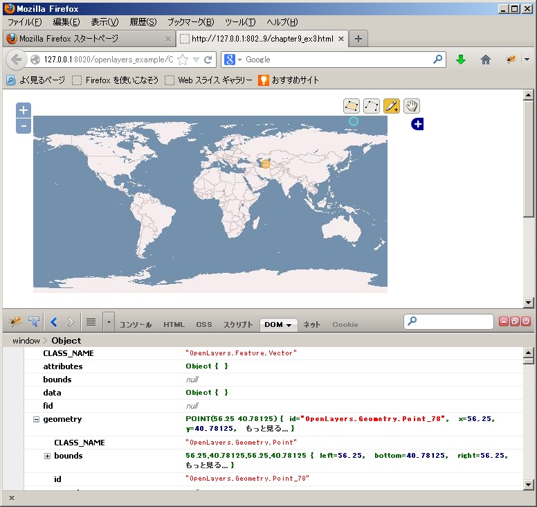 保存後、FireFoxを立ち上げて、http://localhost/openlayers2_12/chapter9/chapter9_ex31.htmlと入力して、Firebugを起動すると、