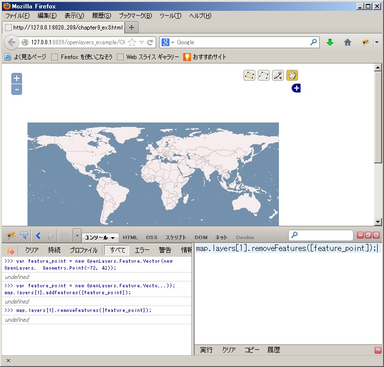 保存後、FireFoxを立ち上げて、http://localhost/openlayers2_12/chapter9/chapter9_ex31.htmlと入力して、Firebugを起動すると、