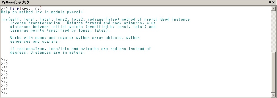 geod.inv関数とは、PyScripterのインタプリタ上でhelp(geod.inv)で