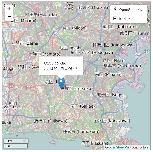 mapMarker.bindPopup(‘CSS3 popup. <br> ここはどこでしょうか?’);