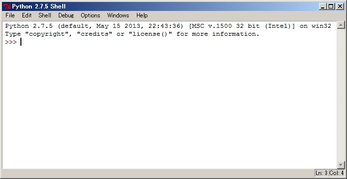 スタート → プログラム → Python 2.7 → IDLE(Python GUI)でShellを動かすと、