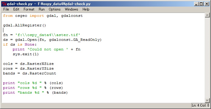 保存先はf:¥python_example¥chapter_3¥ folderにgdal-example.pyで保存します。