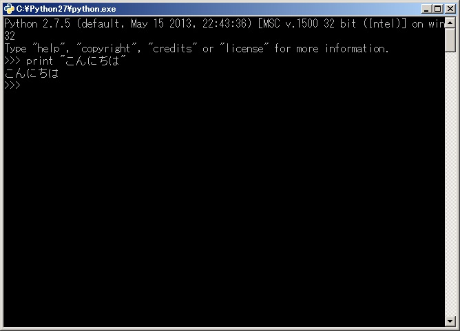 次に、スタート → プログラム → Python 2.7 → Python(command line)でPythonを動かします。